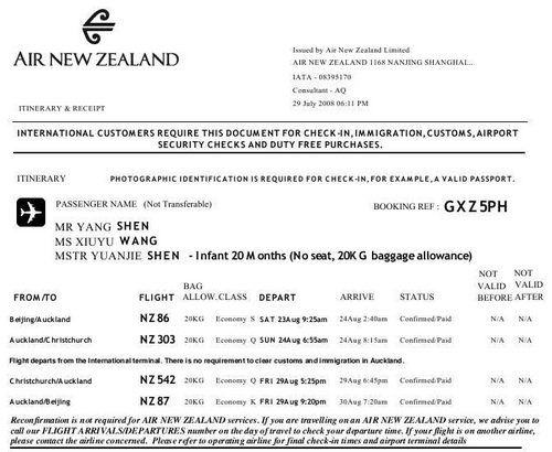 北京和新西兰的直航是2008年7月19日通航的,据说也是专为奥运开辟的一条便捷航线,我提前在新西兰航空公司的网站订了电子票(中文网站http://www.airnewzealand.cn/ 或者英文网站http://www.airnewzealand.com.cn/采用的是中国cn二级和三级域名),现在正在促销,成人往返北京——基督市10242元,沈瑗杰不满2岁,免税且票价是全价的十分之一810元,2个大人一个婴儿往返票价是21294rmb,网上订电子机票比直接在新西兰航空公司买便宜三千多元。