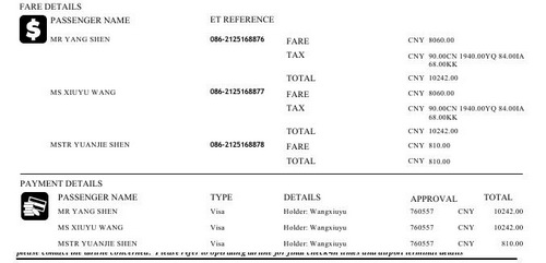 成人机票单人价格是8060元,税是2182元,共计10242元,可以携带20公斤行李;婴儿是810元,免税,婴儿没有座位,但可以携带20公斤行李,三个人可以携带60公斤重的行李,2个座位,我在网站上顺便帮沈瑗杰订了婴儿餐。