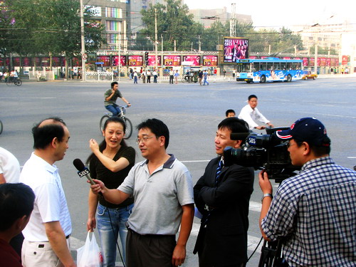 韩国SBS电视台在蓝岛大厦门口采访中国人。 摄像记者一见美女便抓拍,把人家也吓坏了。
