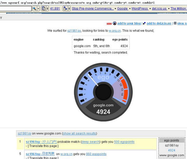 EGO Points值是评价一个Blog 指标:Just enter your name and your blogs web address.We search google and find links to your blog. We calculate your ego ranking.