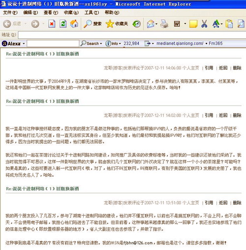 发表于 2007-12-7 22:50:00 拙文《说说十进制网络(1)旧瓶换新酒》(http://www.w.org.cn/user1/4/archives/2007/1513.html )文后留下一位署名“龙哥”网友留下三段留言,根据查询后台,它来自“222.244.*.*”这个属于“湖南省长沙市 电信”网段上网网友,现抄录如下: