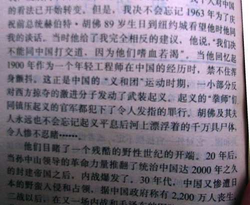有人老拿爱国主义作为抵制中国家乐福的理由,问题是:证据呢?有了证据也该依法惩罚人家,干嘛拿破坏咱们国家公共秩序安全作为“爱国”代价?下面扫描一段美国前尼克松在1988年写《1999 不战而胜》一书对中国满清政府在血腥镇压义和团后留给外国人的印象。