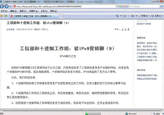 以张庆松先生为首的“十进制网络IPv9利益集团”代言人近一年来以“IPV9海外之友”及“IPV9海外之友评论组”“两个都是实名”的法律逻辑“驳斥”本人的“IPv9营销聊”及“IPv9革命论”,同时增加了不少博客出口,提出了他们不少“合法”证据。其中,作者署名“IPV9海外之友”(归类“合作发表” 、网上发表时间:“2009-08-04 22:42”)《工信部和十进制工作组:驳IPv9营销聊(9)》一文全文如下: