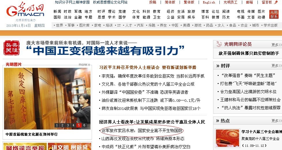 光明网记者沈阳(下称记者):吕老师,您好!如果我没记错的话,这是我同你近一年来的第三次访谈。前两次访谈内容公布后,收到很多网友反馈,感谢您给我们传递了很多最顶层设计涉及的问题信息。这次访谈,我想请你谈一个大家很关注的话题。你一定注意到刚刚结束的十八届三中全会公报,其中提到中国将设立国家安全委员会。你对这件事是怎么看的。